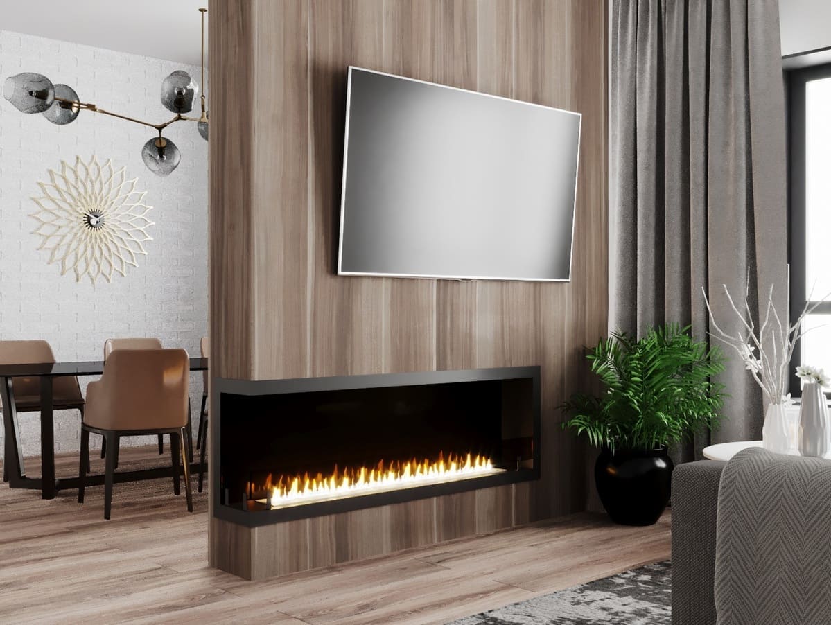 Декоративное стекло — крепится на всю заднюю стенку очага. За счет своего зеркального отражения, пламя визуально становится в 2 раза больше и кажется, что камин горит еще ярче.